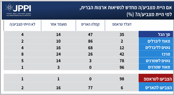 - 98% ממצביעי טראמפ היהודים היו בוחרים בו שוב, לעומת 77% ממצביעי האריס