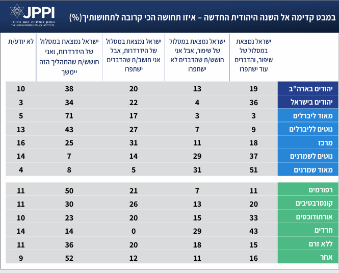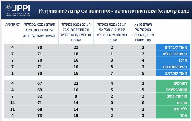 גם בסוגיית עתידה של ישראל הפילוח האידאולוגי מצביע על הבדלים משמעותיים: בקרב ה"מאוד ליברלים" רוב מוחלט (%71) סבורים שישראל מידרדרת, ורק 3% אופטימיים. מנגד בקרב ה"מאוד שמרנים" מחצית (51%) מאמינים שישראל כבר נמצאת בתהליך של שיפור – ושעוד תשתפר, ורק 8% סבורים שהיא מידרדרת. בחלוקה לפי דתיות קיימת מגמה דומה: 50% מהרפורמים סבורים כי ישראל במסלול של הידרדרות שצפויה להימשך, לעומת 43% מהחרדים ו-33% מהאורתודוכסים שמביעים אופטימיות באשר להמשך השיפור.