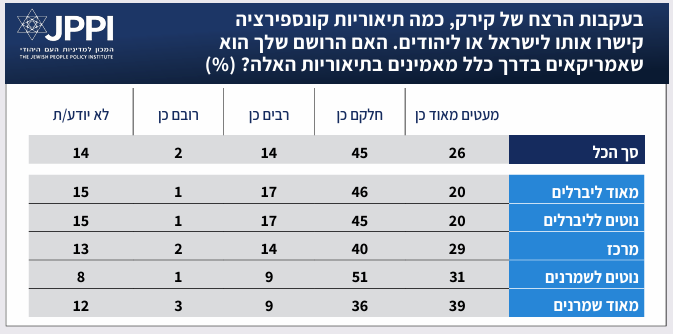 - 40% המשיבים: צ'ארלי קירק היה "ידיד של יהודי ארה״ב״; רוב: היה ״ידיד ישראל״