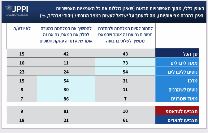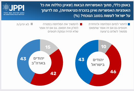 15% ממשתתפי הפאנל לא ידעו להשיב לשאלה זו. תשובות אלה כמעט זהות לתשובות בקרב היהודים בישראל במדד JPPI לחברה הישראלית. בפאנל המשיבים של יהודי ארה״ב, רוב השמרנים והמשתייכים לקבוצת ה"מרכז" סבורים שבמצב הנוכחי ישראל צריכה להמשיך את המלחמה במטרה לסלק את חמאס, גם במחיר שלא תהיה עסקת חטופים. מנגד, רוב הליברלים תומכים בסיום המלחמה והחזרת החטופים, גם במחיר ששלטון חמאס ימשיך לשלוט ברצועה. מגמה דומה קיימת גם בחלוקה לפי דתיות. רוב של חרדים ואורתודוכסים תומכים בהמשך המלחמה, ורוב של רפורמים קוראים לסיומה. בהתאם לחלוקה האידאולוגית, רוב (81%) מצביעי טראמפ בעד המשך המלחמה בעזה, ורוב (61%) מצביעי האריס בעד סיומה.