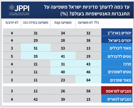 ככול שמתקדמים על הסקלה האידאולוגית מהכיוון הליברלי לכיוון השמרני עולה שיעור המשיבים שאינם רואים קשר בין המדיניות של ישראל לבין התגברות האנטישמיות ברחבי העולם. שמינית מבין המזהים עצמם "מאוד ליברלים" סבורים שאין קשר, לעומת רוב (64%) בקרב המגדירים עצמם "מאוד שמרנים". בהתאמה – ככול שמתקדמים על הסקלה בכיוון ההפוך, עולה שיעור המשיבים שסבורים שהתגברות האנטישמיות נובעת במידה רבה מהמדיניות הישראלית: עשירית בלבד מה"מאוד שמרנים" מחזיקים בעמדה זו, לעומת מחצית מה"מאוד ליברלים".