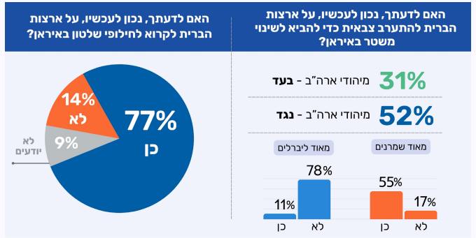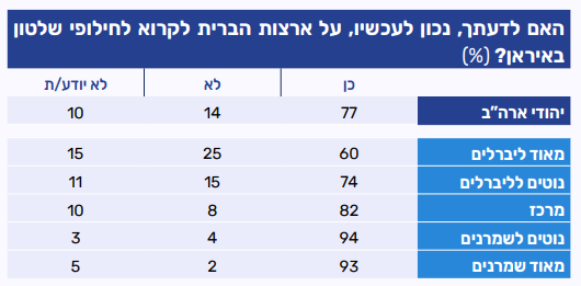 רוב גדול של קבוצת יהודי ארה"ב הנמדדת באמצעות מדד קול העם של JPPI (77%), סבורים שנכון שארה״ב תקרא לחילופי שלטון באיראן, לעומת שמינית (14%) המתנגדים לכך. בחלוקה אידאולוגית ניכרת עלייה הדרגתית בתמיכה בקריאה לשינוי, ככל שהעמדה האידיאולוגית של המשיבים שמרנית יותר: בקרב יהודים "מאוד ליברלים" התמיכה נמוכה יחסית אך עודה תמיכה של רוב המשיבים, עם 60% בעד לעומת 25% נגד. בקרב ה"נוטים לליברלים" התמיכה עולה ל-74%, בעוד שיעור המתנגדים יורד ל-15%. במרכז נרשמת תמיכה גבוהה במיוחד של 82%, עם התנגדות של 8% בלבד. בקרב המזהים עצמם "נוטים לשמרנים" ו"מאוד שמרנים" התמיכה כמעט גורפת, עם 94% ו-93% בהתאמה הקוראים לעמדה אמריקאית שתומכת בחילופי שלטון.