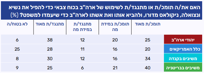 בחנו האם יהודי ארה"ב, קנדה ובריטניה תומכים או מתנגדים למהלך זה של ארה״ב, והשוונו את התוצאות שהתקבלו לממצאים של סקר בנוסח זהה של כלל האמריקאים (YouGov). מחצית מיהודי ארה"ב מתנגדים ("מתנגדים מאוד" + "מתנגדים במידת מה") לשימוש של ארה"ב בכוח צבאי כדי להפיל את נשיא ונצואלה ולהביאו למשפט. מנגד, 45% תומכים במהלך זה ("תומכים מאוד" + "תומכים במידת מה"). בקרב יהודי קנדה נרשמה תמונה דומה, כשמחצית מהם תומכים במהלך ו-42% מתנגדים לו. בסקר הקטן יותר בבריטניה ניכרה תמיכה גבוהה יותר במהלך צבאי: רוב (61%) תומכים בו ("מאוד תומכים" + "תומכים במידת מה"), בעוד שיעור המתנגדים נמוך ועומד על שליש. בהשוואה של תוצאות אלה לסקר שבחן את עמדות כלל הציבור בארה"ב, נרשם שיעור נמוך יותר הן של תומכים במהלך והן של מתנגדיו, שנובע מכך שרבע (25%) מהאמריקאים אינם בטוחים מה עמדתם בסוגיה זו.