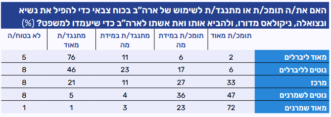 ככול שמתקדמים על הסקלה האידאולוגית מהכיוון הליברלי לכיוון השמרני, עולה שיעור המשיבים הסבורים שארה"ב צריכה להתערב צבאית באיראן. בעוד שרוב הליברלים חושבים שארה"ב לא צריכה להתערב, רוב השמרנים חושבים שעליה להתערב. חלוקה זו באה לידי ביטוי גם בחלוקה לפי הצבעה: רוב מצביעי טראמפ (59%) סבורים שארה"ב צריכה להתערב צבאית באיראן, לעומת רוב מצביעי האריס (70%) שמתנגדים לכך.