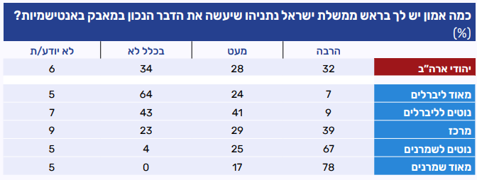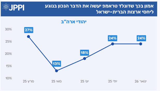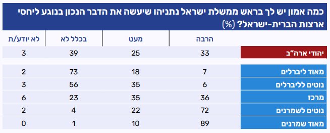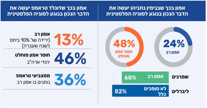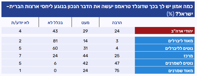 גם החודש נרשמה רמת אמון נמוכה יחסית של היהודים בכך שנשיא ארה"ב, דונלד טראמפ, יעשה את ״הדבר הנכון״ בנוגע ליחסי ארה"ב-ישראל. רבע 24% מביעים בו הרבה אמון בהקשר זה, לעומת 29% שיש להם מעט אמון ו-43% שאינם נותנים בו אמון כלל. בפילוח אידאולוגי עולים פערים משמעותיים: בקרב הקבוצות הליברליות נרשם רוב שמעידים כי בכלל אין להם אמון בטראמפ בהקשר ליחסי ארה"ב-ישראל. לעומת זאת, במרכז התמונה מורכבת יותר: רבע מביעים הרבה אמון, כמחצית מעט אמון, ורבע נוסף כלל לא. בקרב ה"נוטים לשמרנים" רמת האמון גבוהה משמעותית, עם מחצית שמביעים הרבה אמון ובקרב "מאוד שמרנים" האמון כמעט מוחלט (75%).