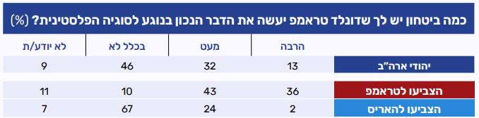 ביחס לשנה שעברה, נרשמה ירידה של 10% בשיעור היהודים בארה"ב המעידים כי יש להם אמון רב בנשיא בסוגיה הפלסטינית – בעוד שבפברואר 25 רבע ממשתתפי הפאנל (23%) השיבו שיש להם אמון רב בטראמפ, החודש נרשם כי שמינית בלבד (13%) חושבים כך.