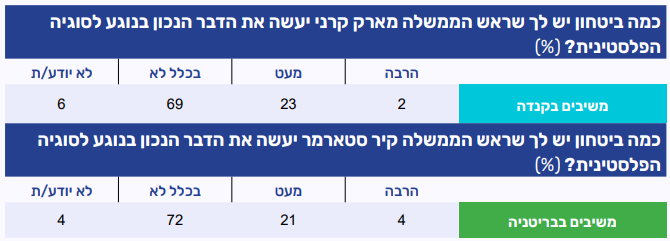 בקרב יהודי קנדה ובריטניה נרשמה רמת אמון נמוכה מזו שנרשמה בארה"ב בכך שראשי הממשלות שלהם, מארק קרני וקיר סטארמר, יעשו את הדבר הנכון בנוגע לסוגיה הפלסטינית. בקנדה נרשם רוב של 69% המעידים כי בכלל אין להם ביטחון שקרני יעשה את הדבר הנכון. בבריטניה רוב גדול של משיבים (72%) מעידים כי בכלל אין להם אמון שסטארמר יעשה את הדבר הנכון בהקשר לסוגיה הפלסטינית.