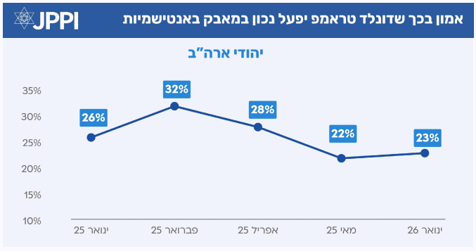מאז כניסתו של טראמפ לבית הלבן בינואר 2025, חלו תנודות ברמת האמון של יהודי ארה"ב באופן שבו הוא מטפל בסוגיית האנטישמיות. בעוד שבתחילת כהונתו הייתה עלייה באמון, החל מאפריל האחרון קיימת ירידה איטית אך נמשכת במדד זה, כשבחצי שנה האחרונה הוא התייצב על שיעור של רבע מהיהודים שנמדדים בסקר.
