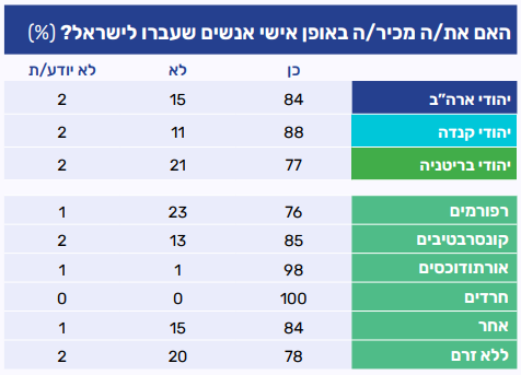 בחנו עם משתתפי הפאנל האם הם מכירים באופן אישי יהודים שעברו לישראל. רוב המשתתפים, מכלל הארצות (%84 בארה"ב, %88 בקנדה ו-%77 בבריטניה), מכירים באופן אישי אנשים כאלה. בחלוקה לפי דתיות נרשם כי ככול שהמשיבים משתייכים לקבוצות יותר שמרניות, כך עולה שיעור אלו מהם שמכירים יהודים שעלו לישראל. בעוד ששלושה מכל ארבעה רפורמים אמרו שהם מכירים אנשים כאלה, כל האורתודוכסים אמרו שהם מכירים.