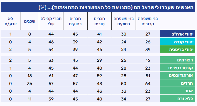 שיעור גבוה ממשתתפי הפאנל ציינו כי הם מכירים חברים רחוקים, חברי קהילה וחברים טובים שעברו לישראל, כאשר בבריטניה בולט במיוחד הקשר הקהילתי (54%). הפילוח לפי זרמים דתיים מלמד כי בקרב אורתודוכסים וחרדים מדובר בתופעה נרחבת, הכוללת בני משפחה קרובים ושכנים, בעוד שבקרב רפורמים ומי שאינם שייכים לאף זרם הכרות עם מי שעלו לישראל היא בעיקר של חברים ומעגלים רחוקים יותר.