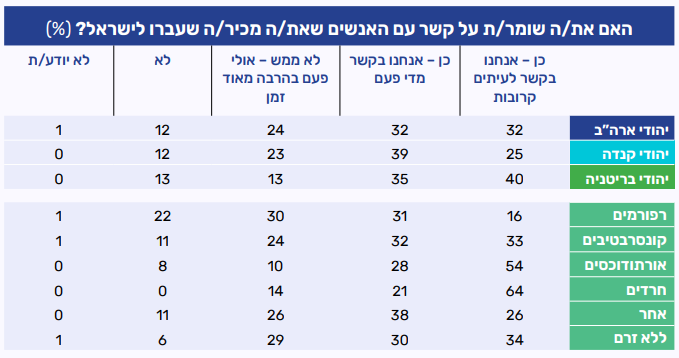 משתתפי הפאנל מעידים על כך שנשמר קשר עם יהודים שעברו לישראל, אם כי בעוצמות שונות. בקרב יהודי ארה״ב וקנדה כשני שלישים מהנשאלים מציינים שהם שומרים על קשר תדיר או מזדמן, ואילו בבריטניה שיעור זה אף גבוה יותר, עם שלושה רבעים (75%) המדווחים על קשר מתמשך. בחלוקה לפי דתיות עולה כי בקרב אורתודוכסים וחרדים הקשר הדוק במיוחד, כאשר רובם מציינים קשר תכוף, בעוד שבקרב רפורמים נרשמת רמת ריחוק גבוהה יותר, עם שיעור ניכר שמדווחים על קשר נדיר או היעדר קשר כלל. כמובן, טבעי לצפות שרמת הקשר תהיה שונה על פי סוג האנשים שיש איתם הכרות שעברו לישראל.