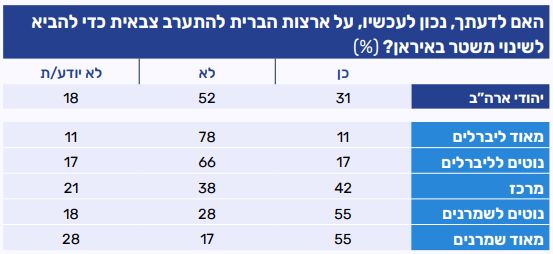 בהמשך לשאלה על קריאה לשינוי משטר, בחנו האם משתתפי הפאנל סבורים שהמדינות שלהם צריכות להתערב צבאית כדי להביא לשינוי משטר באיראן. מחצית מהיהודים בארה"ב (52%) סבורים שארה"ב לא צריכה להתערב צבאית באיראן במטרה להביא לשינוי משטרי. מנגד שליש (31%) חושבים שעליה להתערב וחמישית (18%) לא ידעו להשיב לשאלה זו.