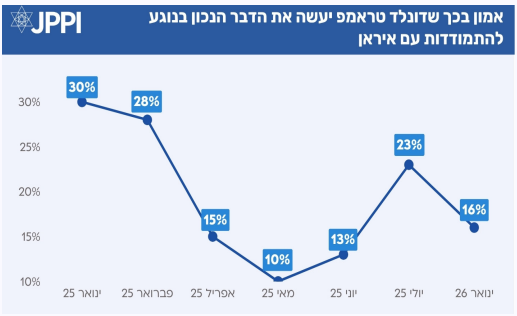 הרקע לסקר: נתוני מדד קול העם לחודש ינואר נאספו בין ה-15 ל-20 בחודש. במהלך החודש האחרון היו מספר אירועים בולטים שהשפיעו על בחירת השאלות בסקר ועל העמדות המשתקפות בו: ארה"ב יצאה בתחילת החודש למבצע צבאי נרחב בוונצואלה, שהסתיים בלכידתו ובמעצרו של הנשיא ניקולס מדורו. במקביל, ההפגנות באיראן נגד השלטון התעצמו והתפשטו לעשרות ערים. המשטר דיכא את ההפגנות בברוטליות. ארה״ב איימה להתערב, והנשיא טראמפ אף אמר ״העזרה בדרך״, ופרסום המסמכים נעשה בשעה שכוחות אמריקאים תוגברו בקרבה לאיראן, וישנה אי בהירות באשר לכוונת הממשל לפעול או להימנע מפעולה באיראן. בזירת המזרח התיכון, הכריז החודש נשיא ארה"ב, דונלד טראמפ, באופן רשמי על הקמת "מועצת השלום", ואף קיים טקס בו מנהיגים בינלאומיים הוזמנו לחתום על אמנת המועצה. תפקידה המקורי של המועצה היה לפקח על הפסקת האש בעזה, אך טראמפ החליט שהיא תפקח גם על סכסוכים נוספים.