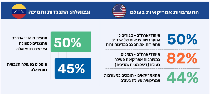 התמיכה או ההתנגדות להפעלת כוח צבאי אמריקאי במטרה להפיל את נשיא ונצואלה מושפעת רבות מהעמדות האידאולוגיות של המשיבים. בעוד שרוב המזהים עצמם "מאוד שמרנים" (95%), "שמרנים" (83%) ומרכז (60%) תומכים בפעולה זו, רוב הליברלים ("נוטים לליברלים" + "מאוד ליברלים") – מתנגדים לפעולה זו. בחלוקה לפי הצבעה נרשם כי רוב מוחלט של מצביעי טראמפ היהודים (90%) תומכים בהתערבות צבאית בוונצואלה, בעוד שלושה רבעים מהיהודים תומכי האריס (74%) מתנגדים לה. נתונים אלה אינם שונים מתוצאות הסקרים בקרב כלל האמריקאים, שלפיהם 66% מהרפובליקנים תומכים במהלך הצבאי של ארה"ב בוונצואלה, ו-63% מהדמוקרטים מתנגדים לו.
