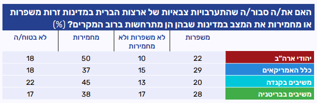 הערה מתודולוגית: בחודשים האחרונים התחלנו לסקור גם את עמדות יהודי קנדה ובריטניה. בשתי המדינות מתגבשים פאנלים הולכים וגדלים. בינואר השיבו לסקר כ-50 משתתפים מבריטניה וכ-130 מקנדה. בהתאם, יש לקחת את הנתונים על עמדות היהודים במדינות אלה בערבון מוגבל. מידת האמינות שלהן פחותה מזו של פאנל יהודי ארה"ב, שכולל מידי חודש מאות משתתפים, והרכב משתתפיו ידוע ונשמר דומה על פני זמן. כאשר מופיעים בדו״ח נתונים לפי אידאולוגיה, דתיות והצבעה, מדובר בפירוט של יהודי ארה"ב בלבד.