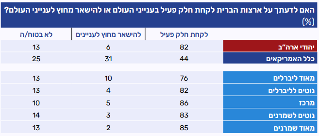 כאשר שאלנו על מעורבות כללית בענייני העולם, ולא במפורש על התערבות צבאית – נרשמו תשובות אחרות. רוב משתתפי פאנל קול העם היהודי (82%) סבורים שארה"ב צריכה לקחת חלק פעיל בענייני העולם, ורק שיעור אפסי מהם (6%) חושבים שהיא צריכה להימנע ממעורבות כזאת. בשאלה זו בולט פער משמעותי בעמדות היהודים בארה״ב לעומת עמדות כלל הציבור האמריקאי, הבדלניות הרבה יותר. בעוד ש-44% מהאמריקאים מאמינים שארה"ב צריכה לקחת חלק פעיל בענייני העולם, שליש (31%) חושבים שהיא לא צריכה להתערב, ורבע לא ידעו להשיב.