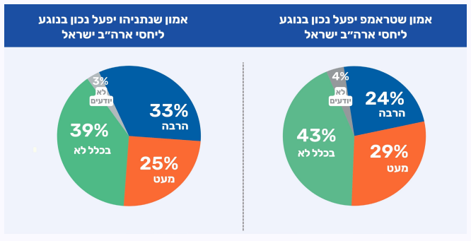 גם החודש נרשמה רמת אמון נמוכה יחסית של היהודים בכך שנשיא ארה"ב, דונלד טראמפ, יעשה את ״הדבר הנכון״ בנוגע ליחסי ארה"ב-ישראל. רבע 24% מביעים בו הרבה אמון בהקשר זה, לעומת 29% שיש להם מעט אמון ו-43% שאינם נותנים בו אמון כלל. בפילוח אידאולוגי עולים פערים משמעותיים: בקרב הקבוצות הליברליות נרשם רוב שמעידים כי בכלל אין להם אמון בטראמפ בהקשר ליחסי ארה"ב-ישראל. לעומת זאת, במרכז התמונה מורכבת יותר: רבע מביעים הרבה אמון, כמחצית מעט אמון, ורבע נוסף כלל לא. בקרב ה"נוטים לשמרנים" רמת האמון גבוהה משמעותית, עם מחצית שמביעים הרבה אמון ובקרב "מאוד שמרנים" האמון כמעט מוחלט (75%).