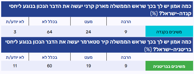 - משיבים בקנדה ובריטניה לא סומכים על ראשי הממשלה שלהם בניהול היחסים עם ישראל