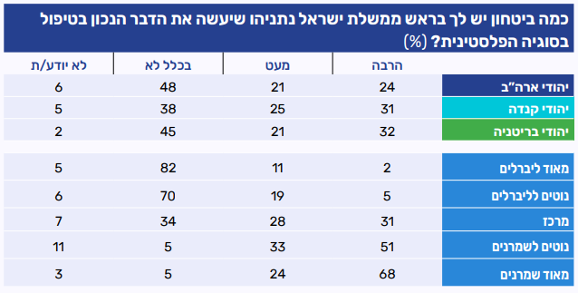 כמעט מחצית מיהודי ארה"ב (48%) מעידים שאין להם כלל ביטחון בנתניהו שיטפל נכון בסוגיה הפלסטינית, רבע (24%) מביעים בו הרבה ביטחון וחמישית (21%) מעט ביטחון. בקנדה ובבריטניה נרשם אמון רב יותר בנתניהו, כששליש מהמשיבים בשתי המדינות (31% ו-32% בהתאמה) מעידים שיש להם הרבה אמון בו. במקביל שיעור המשיבים שאין להם אמון בו נותר משמעותי, עם 45% מהמשיבים בבריטניה ו-38% בקנדה. כלומר, קיימת ספקנות בקרב יהודים ברחבי העולם (דובר האנגלית) ביחס למדיניותו של נתניהו בסוגיה הפלסטינית. ככול שמתקדמים על הסקלה האידאולוגית מהכיוון הליברלי לכיוון השמרני, עולה שיעור המשיבים המעידים כי יש להם הרבה ביטחון שנתניהו יפעל נכון בסוגיה הפלסטינית. בעוד שרוב המשתייכים לקבוצות הליברליות מעידים כי כלל אין להם אמון בראש ממשלת ישראל בסוגיה זו, רוב המשתייכים לקבוצות השמרניות בוטחים בו בהקשר זו.