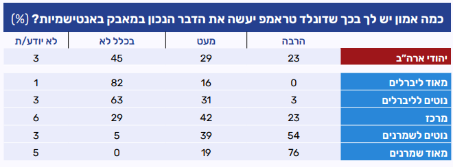 כמעט מחצית ממשתתפי הפאנל (45%) מעידים כי אין להם אמון בכך שנשיא ארה"ב יעשה את הדבר הנכון במאבק באנטישמיות. רבע (29%) מעידים כי יש להם מעט אמון ולרבע נוסף (23%) אמון רב. גם התשובות לשאלה זו מושפעות רבות מהעמדות האידאולוגיות של המשיבים, בעוד שלרוב השמרנים אמון רב בכך שטראמפ יפעל נכון בסוגיית האנטישמיות, רוב הליברלים לא בטוחים בזה.