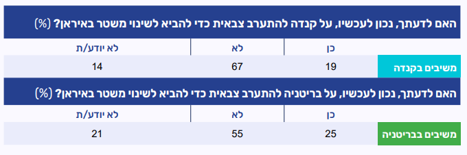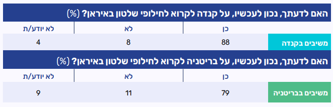 בחנו החודש שאלה זהה גם באמצעות הפאנל של יהודי קנדה ובריטניה, שעודו ניסיוני, בנוגע למדיניות של הממשלות במדינות אלה. בקרב יהודי קנדה נרשמה הסכמה משמעותית אף יותר (88%) מאשר בארה"ב לכך שהמדינה צריכה לקרוא לחילופי שלטון באיראן. בקרב המשיבים מקרב יהודי בריטניה (שמספרם קטן יחסית) נרשם שיעור דומה (79%) לזה שנמדד בארה"ב.