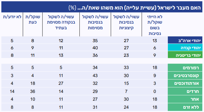 • כחמישית מהמשיבים שוקלים או עשויים לשקול עלייה לישראל; רוב גדול לא שוקלים