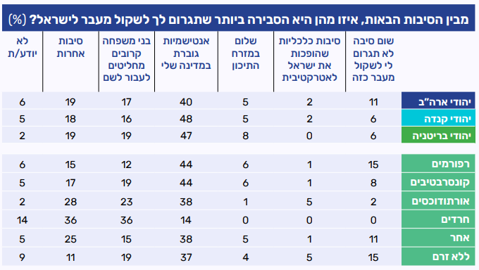 כשבחנו את הסיבות שעשויות לגרום למשתתפי הפאנל לשקול מעבר לישראל, האנטישמיות נרשמה כסיבה המרכזית, כאשר ארבעה מכל עשרה יהודים בארה"ב השיבו כך, וכמעט מחצית מהמשיבים בקנדה ובבריטניה. הסיבה הבאה בתור שיכולה להוביל לעלייה מבין האפשרויות שהוצגו היא מעבר של בני משפחה קרובים לישראל. אפשרויות שזכו להסכמה מעטה הם שלום במזרח התיכון וסיבות כלכליות שיהפכו את ישראל ליותר אטרקטיבית. עם זאת, חמישית ממשתתפי הפאנל בארה"ב העידו כי סיבות אחרות (כאלה שלא הוזכרו כאפשרות) יכולות לגרום להם לשקול מעבר, ועשירית אמרו ששום סיבה לא תגרום להם לשקול לעבור לישראל. בחלוקה לפי דתיות נרשם בכל הקבוצות, מלבד החרדים, שאנטישמיות היא שיכולה להיות גורם מרכזי שיגרום ליהודים לשקול מעבר לישראל. בקרב החרדים הסיבה המרכזית שתוביל לכך היא מעבר של בני משפחה קרובים שמחליטים לעבור, או סיבות אחרות.