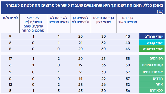 שמינית מיהודי ארה"ב מעידים שאינם שוקלים לעלות לישראל בשום נסיבות, רבע מהם אומרים כי הם עשויים לשקול זאת בנסיבות קיצוניות, שליש אומרים שישקלו זאת בנסיבות מסוימות ושמינית אומרים כי הם עשויים לשקול זאת בנקודה מסוימת בעתיד. פחות מעשירית מהיהודים שהשיבו לסקר מעידים כי הם שוקלים עליה כעת. בקרב משתתפי הפאנל בקנדה ובבריטניה נרשמו תוצאות דומות. בחלוקה לפי דתיות נרשם כי ככול שמתקדמים מקוטב הפרוגרסיבי לקוטב האורתודוכסי, עולה שיעור המשיבים השוקלים לעלות לישראל ויורד שיעורם של מי שלא היו שוקלים זאת.