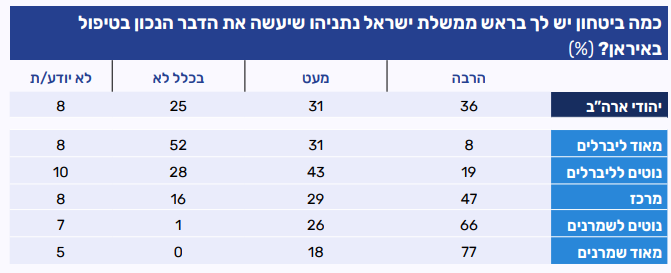 שליש מיהודי ארה"ב מביעים ביטחון בראש ממשלת ישראל בנימין נתניהו בהקשר לטיפול בסוגיה האיראנית, לעומת שליש שמביעים מעט ביטחון ורבע שאין להם ביטחון בו כלל. בקנדה ובבריטניה רמת הביטחון בנתניהו גבוהה יותר, כאשר מעל מחצית מהנשאלים בשתי המדינות ציינו שיש להם הרבה ביטחון בנתניהו בסוגיה זו (54% בקנדה ו-51% בבריטניה). בחלוקה אידאולוגית נרשמו פערים משמעותיים: רוב המזהים עצמם "מאוד ליברלים" מצהירים שאין להם כלל אמון בנתניהו, לעומת מחצית מהמזהים עצמם "מרכז" ורוב המשתייכים לקבוצות השמרניות, שמביעים הרבה ביטחון בנתניהו בהקשר זה.