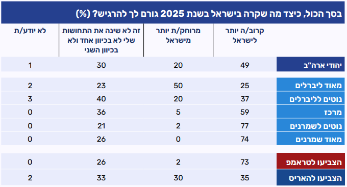 ככול שמתקדמים על הסקלה האידאולוגית מהכיוון הליברלי לכיוון השמרני עולה שיעור המשיבים המעידים כי הם חשים קרובים יותר לישראל, ויורד שיעור אלו שמרגישים מרוחקים יותר מישראל. בקרב "מאוד ליברלים" מחצית מהמשיבים (50%) מרגישים רחוקים יותר מישראל בעקבות האירועים של שנת 2025, ורבע (25%) מדווחים על תחושת קרבה. בקרב "נוטים לליברלים" 37% חשים קרובים יותר לישראל, שיעור דומה (40%) מציינים כי לא חל שינוי בתחושותיהם וחמישית (20%) מרגישים רחוקים יותר מישראל. לעומת זאת, במרכז ובקבוצות השמרניות ניכרת תחושת קרבה גדולה יותר לישראל. רוב המגדירים עצמם מרכז מדווחים על תחושת קרבה גוברת (59%), ושיעור החשים ריחוק נמוך (5%). מגמה זו מתחזקת עוד יותר בקרב "נוטים לשמרנים" ו"מאוד שמרנים", שם כשלושה רבעים (77% ו-74% בהתאמה) חשים קרובים יותר לישראל. בחלוקה לפי הצבעה נרשמה מגמה דומה: רוב מצביעי טראמפ מביעים תחושת קרבה גוברת לישראל (73%), בעוד שמצביעי האריס חלוקים בדעתם. שליש מהם (35%) מרגישים קרובים יותר, שליש (30%) רחוקים יותר ושליש (33%) מעידים כי השנה האחרונה לא שינתה את תחושותיהם כלפי ישראל.