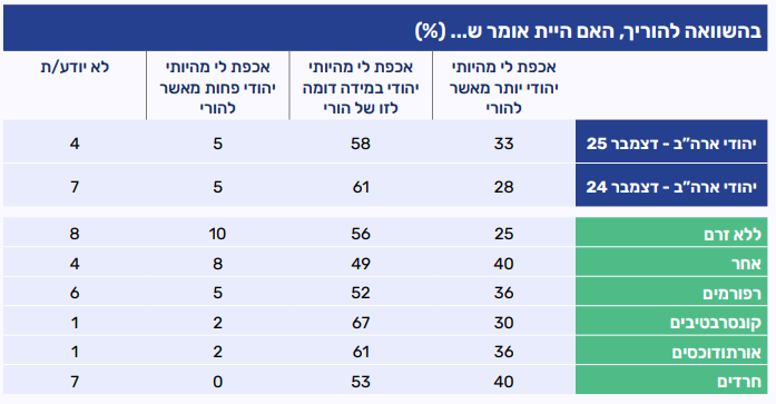 שליש מהמשיבים (35%) מדווחים כי אכפת להם מהיותם יהודים יותר מאשר לילדיהם, עלייה קלה לעומת שנת 2024. במקביל, שיעור דומה אומרים שאין הבדל דורי בינם לבין ילדיהם בהקניית חשיבות לזהות היהודים (37%), ושיעור אפסי מציינים כי לילדיהם אכפת יותר מהיותם יהודים. כמו בשאלה הקודמת על דור הילדים, גם כאן רבע מהמשיבים (27%) מציינים כי אין להם ילדים או אינם יודעים להשיב. בחלוקה לפי דתיות עולים הבדלים בתפיסת ההמשכיות הבין דורית: בקרב רפורמים וקונסרבטיבים בולטת התחושה כי ההורים מחוברים לזהות היהודית יותר מילדיהם (41% ו-37% בהתאמה), בעוד שבקרב אורתודוכסים וחרדים ניכרת נטייה חזקה לראות דמיון בין הדורות (51% ו-53% בהתאמה).