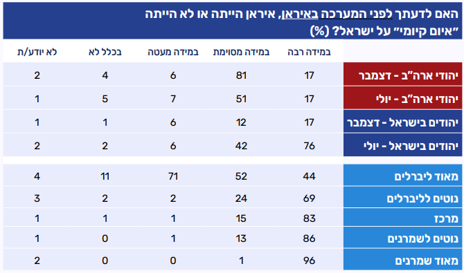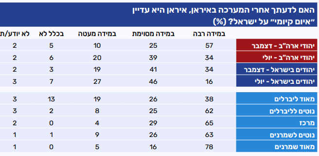 בקרב יהודים "מאוד ליברלים" שיעור הרואים באיראן איום קיומי במידה רבה נמוך יחסית (38%), ולצידו נרשם שיעור גבוה יותר של מי שסבורים כי מדובר באיום קטן או באיום שאינו קיים כלל. ככל שהעמדות נוטות למרכז ולעמדות שמרניות, גוברת ההערכה שאיראן היא איום קיומי משמעותי, כשהשיא נרשם בקרב "מאוד שמרנים" – ארבעה מכל חמישה מהם (78%) סבורים כך.