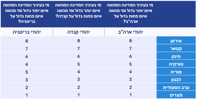 משתתפי הפאנל התבקשו החודש לדרג שמונה מדינות לפי מידת האיום שהן מהוות על ישראל. בקרב יהודים בארה״ב, וכן בקרב היהודים במדגם של יהודים בקנדה ובבריטניה (שעודו ניסיוני. קבוצות המשיבים מקנדה ובריטניה קטנות יותר ביחס לקבוצת המשיבים בארה"ב), קיימת הסכמה לפיה איראן היא האיום החמור ביותר על ישראל. עמדה זו דומה לעמדתם של היהודים בישראל. ביחס למדינות אחרות שהופיעו ברשימה, ישנו הבדל בתפיסת האיומים בין הקהילות היהודיות השונות שנבחנו. בקרב יהודי ארה״ב ויהודי קנדה ובריטניה קטאר היא שמדורגת כאיום במקום השני, בעוד שבקרב יהודים בישראל היא מדורגת מעט יותר נמוך, במקום השלישי. טורקיה היא שנתפסת כאיום המשמעותי יותר בקרב יהודים בישראל, לאחר איראן, אך היא מדורגת במקום נמוך יותר בתשובות של יהודי ארה״ב ויהודי קנדה ובריטניה. פער דומה ישנו גם ביחס לדירוג של תימן.