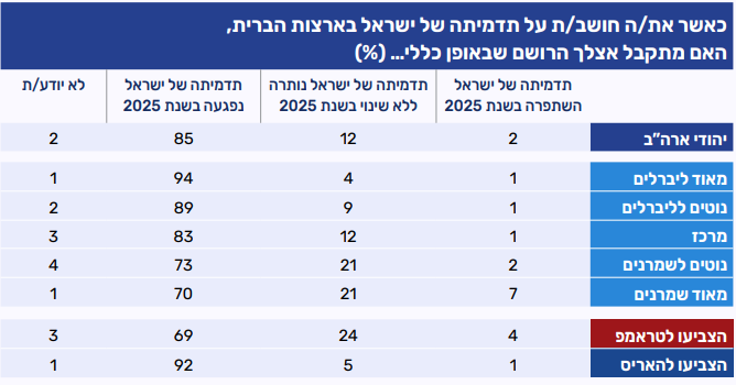 ככול שמתקדמים על הסקלה האידאולוגית מהכיוון הליברלי לכיוון השמרני עולה שיעור המשיבים המעידים כי הם חשים קרובים יותר לישראל, ויורד שיעור אלו שמרגישים מרוחקים יותר מישראל. בקרב "מאוד ליברלים" מחצית מהמשיבים (50%) מרגישים רחוקים יותר מישראל בעקבות האירועים של שנת 2025, ורבע (25%) מדווחים על תחושת קרבה. בקרב "נוטים לליברלים" 37% חשים קרובים יותר לישראל, שיעור דומה (40%) מציינים כי לא חל שינוי בתחושותיהם וחמישית (20%) מרגישים רחוקים יותר מישראל. לעומת זאת, במרכז ובקבוצות השמרניות ניכרת תחושת קרבה גדולה יותר לישראל. רוב המגדירים עצמם מרכז מדווחים על תחושת קרבה גוברת (59%), ושיעור החשים ריחוק נמוך (5%). מגמה זו מתחזקת עוד יותר בקרב "נוטים לשמרנים" ו"מאוד שמרנים", שם כשלושה רבעים (77% ו-74% בהתאמה) חשים קרובים יותר לישראל. בחלוקה לפי הצבעה נרשמה מגמה דומה: רוב מצביעי טראמפ מביעים תחושת קרבה גוברת לישראל (73%), בעוד שמצביעי האריס חלוקים בדעתם. שליש מהם (35%) מרגישים קרובים יותר, שליש (30%) רחוקים יותר ושליש (33%) מעידים כי השנה האחרונה לא שינתה את תחושותיהם כלפי ישראל.