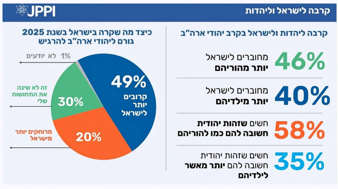 בקרב יהודי ארה"ב נרשמה נטייה כללית לחיזוק הקרבה גוברת לישראל בעקבות האירועים שהתרחשו בשנת 2025. מחצית מהמשיבים (49%) מעידים כי הם מרגישים קרובים יותר לישראל, לעומת חמישית (20%) שמציינים תחושת ריחוק, ושליש (30%) שאינם חשים שינוי.