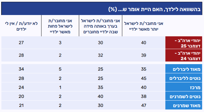 שאלה דומה בנוגע לדור הילדים של המשיבים מעלה כי ישנה תחושה יציבה של חיבור דומה או חזק יותר לישראל בדור ההורים (המשיבים) לעומת דור הילדים. שניים מכל חמישה (40%) מציינים כי הם מחוברים לישראל יותר מילדיהם, שיעור זהה לזה שנמדד בדצמבר 2024. כשליש (30%) סבורים כי רמת החיבור שלהם ושל ילדיהם דומה, ורק מיעוט קטן (3%) מעידים כי ילדיהם מחוברים לישראל יותר מהם. לרבע מהמשיבים (27%) אין להם ילדים, או ציינו שאינם יודעים להשיב.