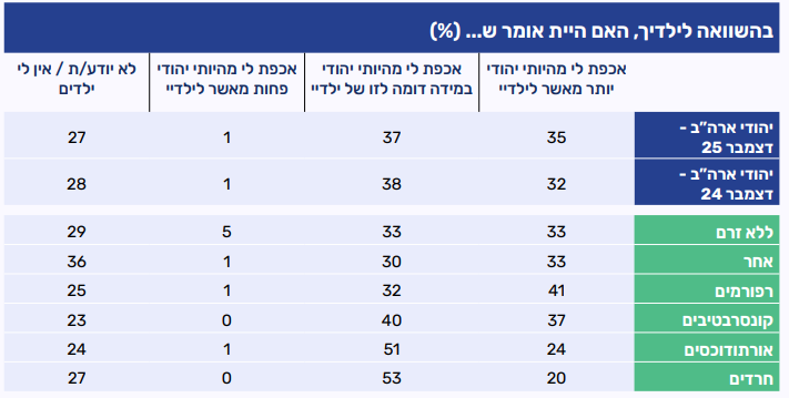 שליש מהמשיבים (35%) מדווחים כי אכפת להם מהיותם יהודים יותר מאשר לילדיהם, עלייה קלה לעומת שנת 2024. במקביל, שיעור דומה אומרים שאין הבדל דורי בינם לבין ילדיהם בהקניית חשיבות לזהות היהודים (37%), ושיעור אפסי מציינים כי לילדיהם אכפת יותר מהיותם יהודים. כמו בשאלה הקודמת על דור הילדים, גם כאן רבע מהמשיבים (27%) מציינים כי אין להם ילדים או אינם יודעים להשיב. בחלוקה לפי דתיות עולים הבדלים בתפיסת ההמשכיות הבין דורית: בקרב רפורמים וקונסרבטיבים בולטת התחושה כי ההורים מחוברים לזהות היהודית יותר מילדיהם (41% ו-37% בהתאמה), בעוד שבקרב אורתודוכסים וחרדים ניכרת נטייה חזקה לראות דמיון בין הדורות (51% ו-53% בהתאמה).