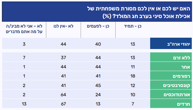 נהוג להניח כי אכילת אוכל סיני בערב חג המולד הפכה עבור משפחות יהודיות רבות למסורת בין דורית, המשלבת הומור, זהות ותחושת שייכות תרבותית. מהנתונים עולה כי מסורת משפחתית כזאת מוכרת ואף נפוצה במידת מה בקרב יהודי ארה"ב, אם כי אינה מתקיימת באופן קבוע. רוב המשיבים (53%) מציינים כי יש להם מסורת משפחתית כזו לפעמים או תמיד, כאשר רובם מקיימים את המסורת לעיתים (40%) ומיעוטם מקיימים אותה באופן קבוע (13%). מנגד, 44% מדווחים כי אין להם מסורת כזו. רק אחוזים בודדים מציינים שאינם מכירים את התופעה. בקרב רפורמים, קונסרבטיבים ומי שאינם משתייכים לזרם דתי מסוים, מעל מחצית מהמשיבים מדווחים על קיומה של המסורת, לפחות לעיתים. לעומת זאת, רוב האורתודוכסים והחרדים מציינים כי אין להם מסורת כזו, מה שאינו מפתיע בהינתן העובדה שהמטבח הסיני ברוב גדול של המקרים אינו מטבח כשר (64% ו-67% בהתאמה).