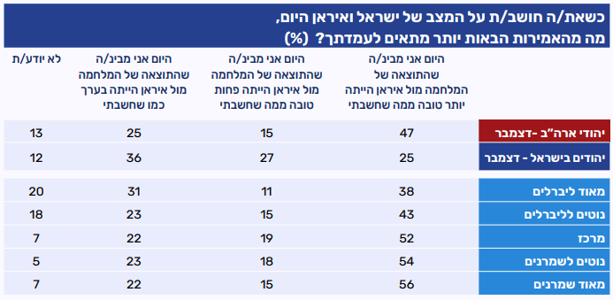 בקרב יהודים "מאוד ליברלים" שיעור הרואים באיראן איום קיומי במידה רבה נמוך יחסית (38%), ולצידו נרשם שיעור גבוה יותר של מי שסבורים כי מדובר באיום קטן או באיום שאינו קיים כלל. ככל שהעמדות נוטות למרכז ולעמדות שמרניות, גוברת ההערכה שאיראן היא איום קיומי משמעותי, כשהשיא נרשם בקרב "מאוד שמרנים" – ארבעה מכל חמישה מהם (78%) סבורים כך.