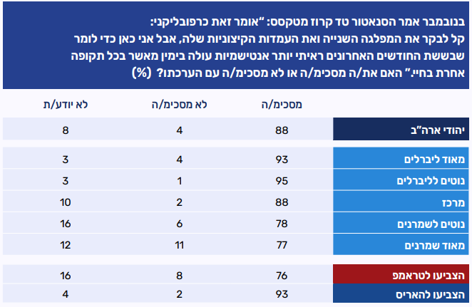 גם בפילוח האידאולוגי והפוליטי נשמרת רמת הסכמה גבוהה עם אמירתו של קרוז, אם כי נרשמים פערים מסוימים בין הקבוצות השונות. בקרב ליברלים שיעורי ההסכמה עם אבחנתו/אזהרתו של קרוז מגיעים ליותר מ-90%, בעוד שבקרב השמרנים שיעורי ההסכמה מעט יותר נמוכים, אך עדיין גבוהים מאוד. בחלוקה לפי דפוסי הצבעה נשמר דפוס דומה: גם בקרב מצביעי טראמפ רוב ברור מסכים עם דבריו של קרוז (76%) ובקרב מצביעי האריס נרשמת הסכמה כמעט גורפת (93%).