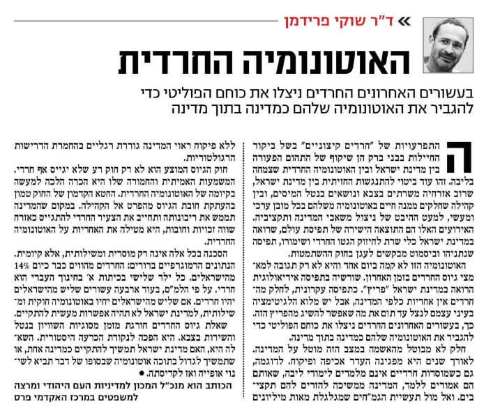 בעשורים האחרונים החרדים ניצלו את כוחם הפוליטי כדי להגביר את האוטונומיה שלהם. אם הרוב הציוני לא יתעשת ישראל תקרוס.