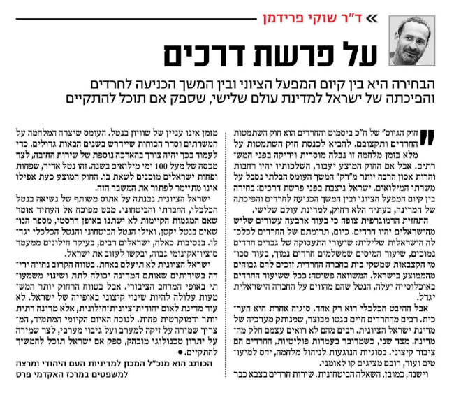 "חוק הגיוס" של ח"כ ביסמוט והחרדים הוא חוק השתמטות החרדים ותקצובם. להביא לכנסת חוק השתמטות על מלא בזמן מלחמה זו נבלה מוסרית ויריקה בפני המשרתים. אבל אם החוק המוצע יעבור, השלכותיו יהיו רחבות והרות אסון הרבה יותר מ"רק" המשך העומס הבלתי נסבל על משרתי המילואים. ישראל ניצבת בפני פרשת דרכים: בחירה בין קיום המפעל הציוני ובין המשך הכניעה לחרדים והפיכתה של המדינה, בעתיד הלא רחוק, למדינת עולם שלישי.