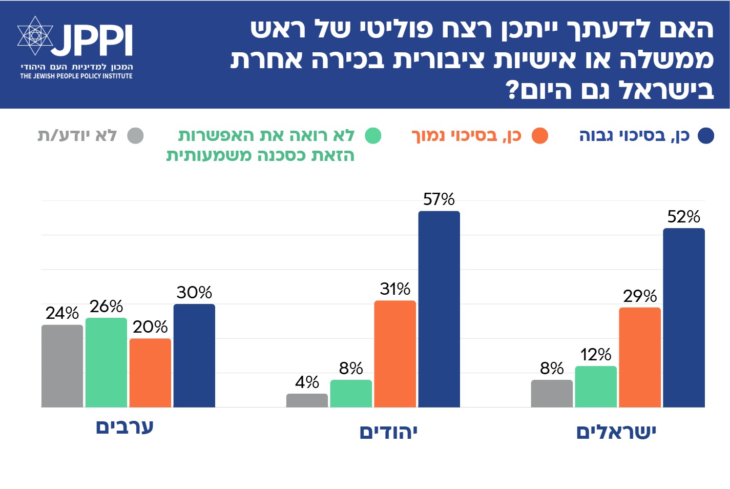 על פי הסקר, 52% סבורים כי יש ״סיכוי גבוה״ לרצח פוליטי של ראש ממשלה או אישיות ציבורית בכירה בישראל ״גם היום״. שליש (29%) מעריכים כי מדובר בסיכוי נמוך, ושמינית (12%) אינם רואים בכך סכנה משמעותית. בקרב יהודים, שיעור המעריכים כי רצח פוליטי נוסף עלול להתרחש בסבירות גבוהה – גבוה יותר (57%), בעוד שבקרב ערבים הוא נמוך יותר, ועומד על שליש (30%).