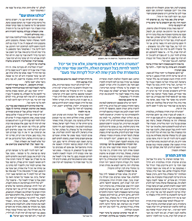 "כל ממשלה, שמאל, ימין, מרכז תצטרך לאמץ את המתווה שלנו – ולא לשכוח שיש אזרחים בקצה. אני איבדתי את אשתי, איבדתי את החברים שלי, את הקהילה שלי, ואני עכשיו מתחיל כאילו מאפס. אני רוצה שזה לא יקרה לא לי, לא לילדיי, לא לנכדיי, ולא לאף אחד מעם ישראל".